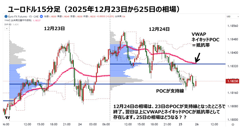 その後、25日は上にあったVWAPとネイキッドPOCが抵抗帯となり、上昇が止められて反落しました。
